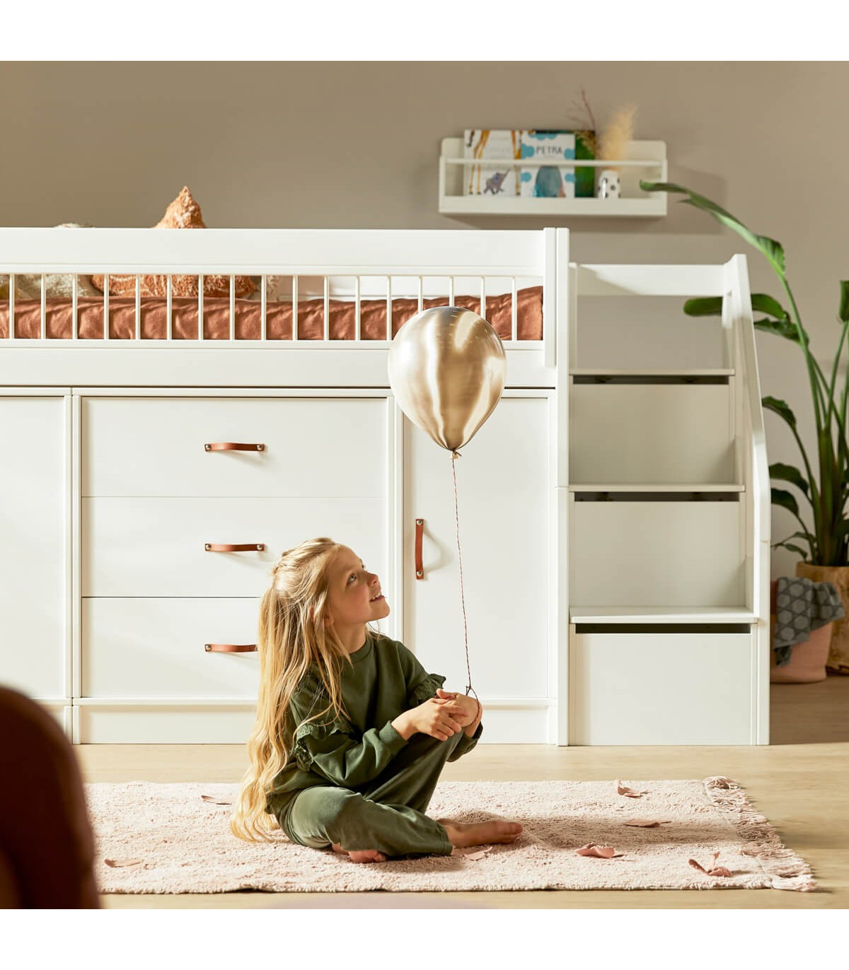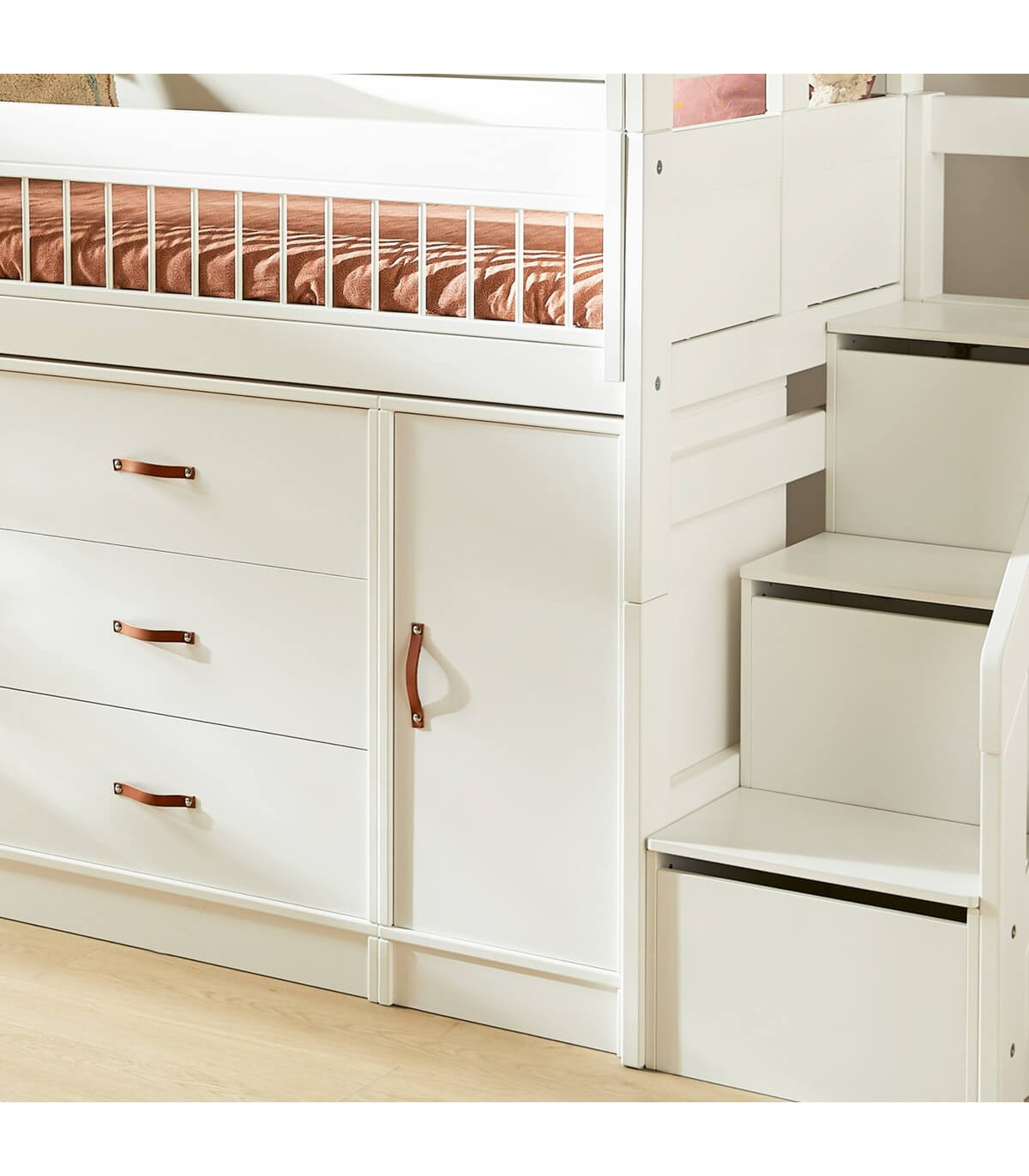 Mit dieser Bettkombination können Sie den Platz für einen zusätzlichen Kleiderschrank sparen, während Ihr Kind geschickt an seine eigene Kleidung herankommt, da die Module in Kinderhöhe sind. Eine ideale Kombination aus sicherem Schlafen oben, geschützt durch solide Bettkanten, cleverer Aufbewahrung in den Stufen der Trittleiter und der Möglichkeit, Selbstständigkeit zu üben, mit zugänglichem Stauraum für Kleidung und Spielzeug.