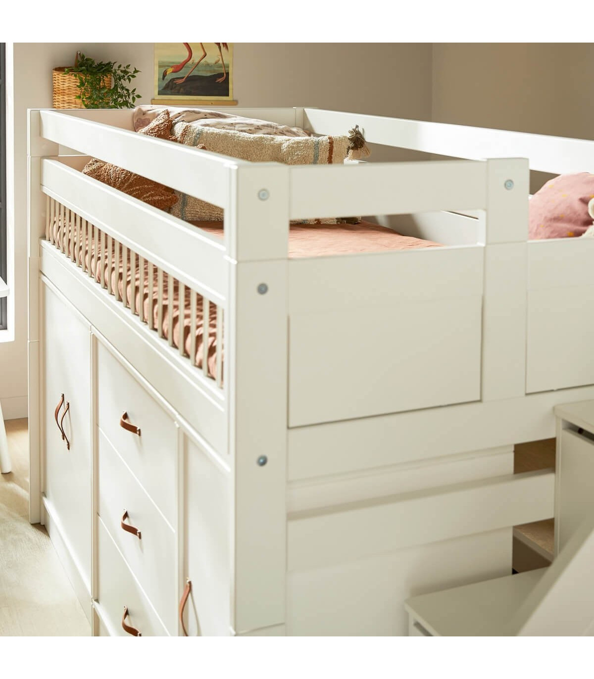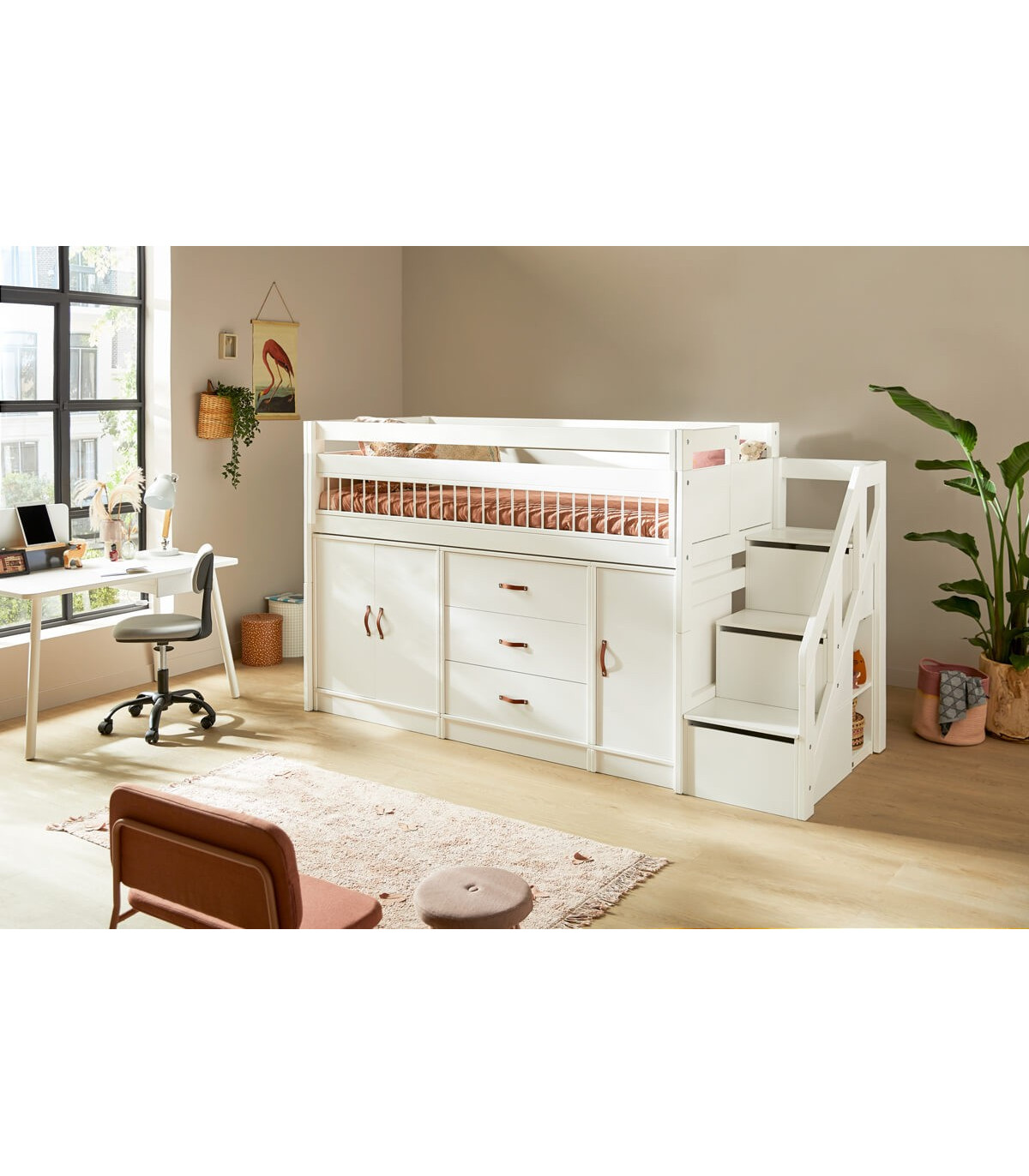 Lifetime Halbhohes Bett All-In-One mit Treppe-Stauraum und Premium Rollboden whitewash