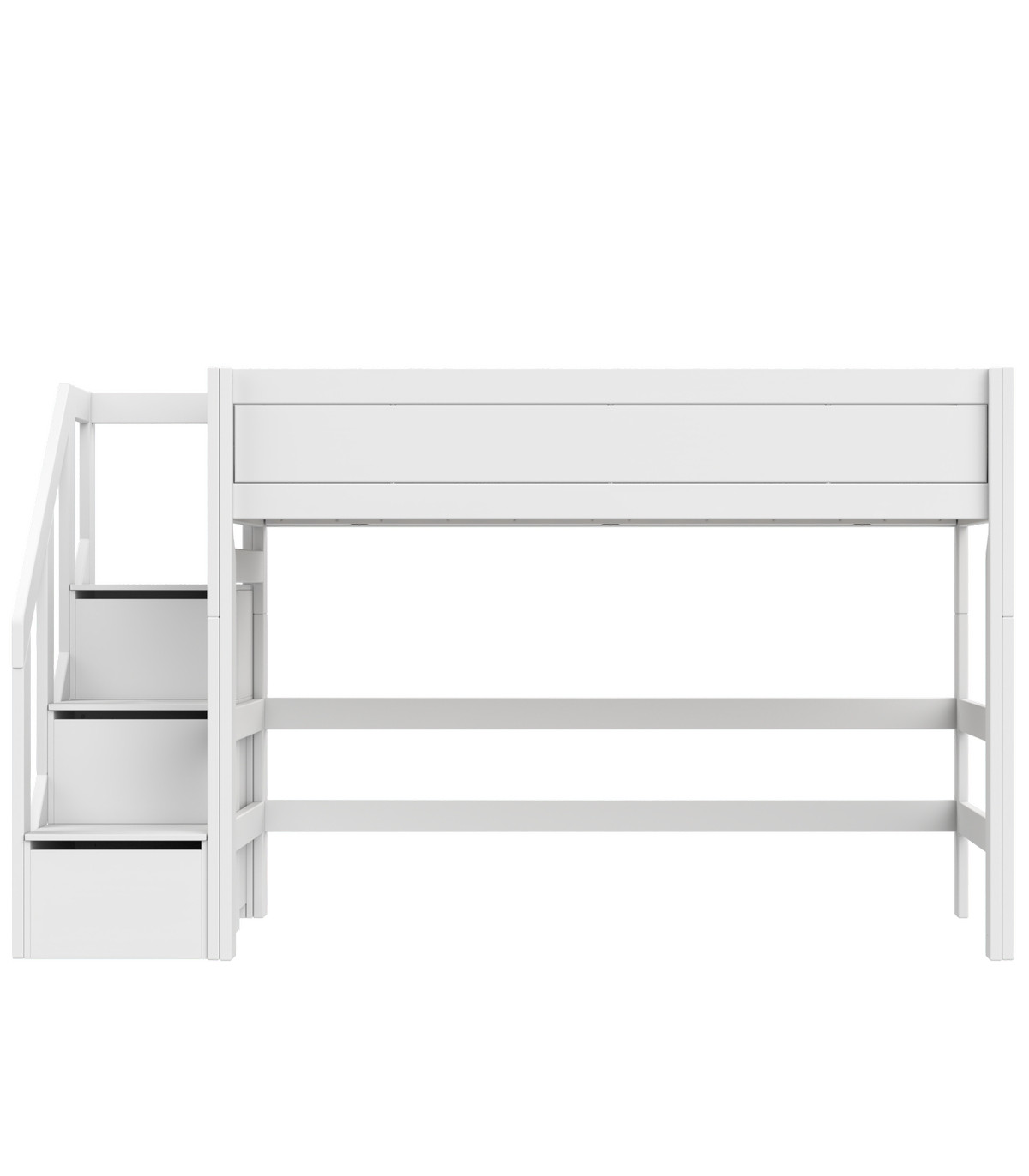 Ein Mittel-Hochbett ist etwas höher als das halbhohe Bett, jedoch immer noch in einer Höhe, die einfach zu erreichen ist, auch zum Betten machen. Die Treppe an der Seite kann links oder rechts angebracht werden und liefert neben einem Platz zum Hochklettern auch noch jede Menge Stauraum.