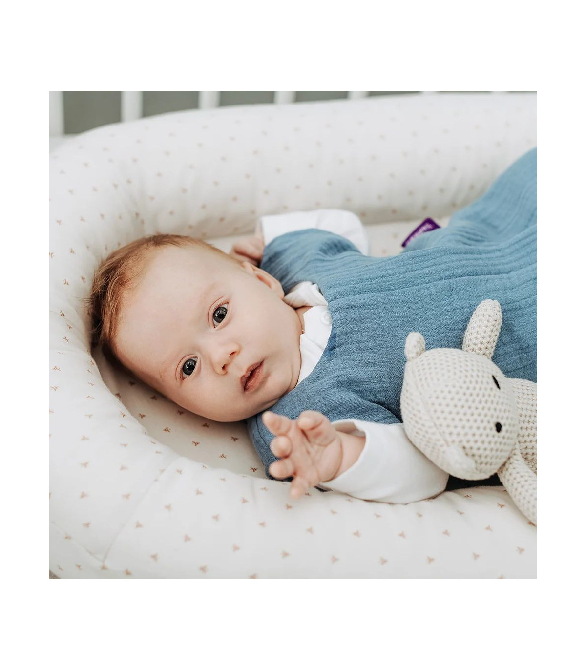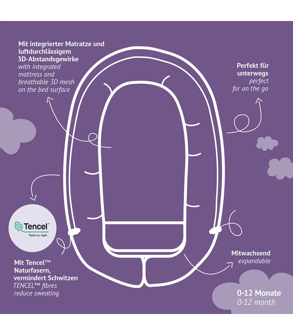Additional lying comfort thanks to the high-quality soft foam mattress, which optimally protects the spine and at the same time gives your baby a cosy feeling. The option of folding out the mattress base makes the nest particularly versatile and suitable for long-term use. Perfect for that cosy feeling at home, even when you're on the move. The nest is pleasantly cosy, with a high-quality jersey cotton fabric that guarantees a soft feeling on your baby's skin.