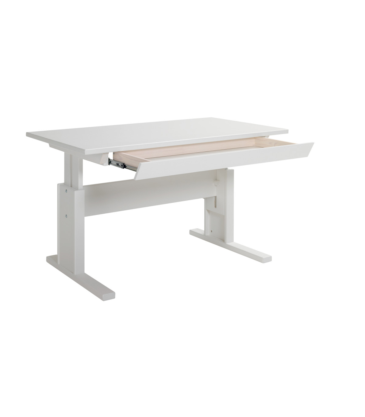 A solid wooden desk that grows with the child. The height can be adjusted from 56 to 78 cm. The plate can also be tilted in 0, 10 and 20 degrees to be ergonomically adjusted if preferred. The front bar always remains horizontal and, when tilting the plate, gives an edge that holds books and sheets in position.