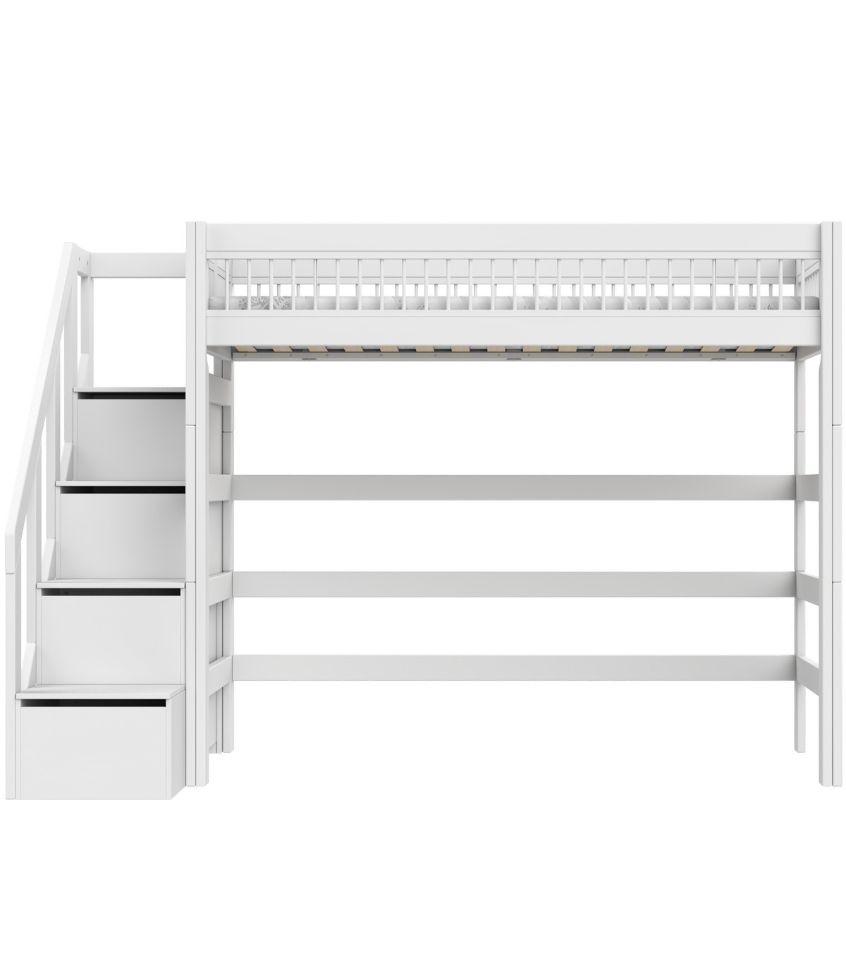 The clever staircase has hidden storage space for easily stowing away children's toys, allowing parents to clear the floor of scattered toys. Wide steps provide a secure ascent for your child, and the staircase even has a handrail for children to hold onto when it's time to sleep and fatigue sets in. On the side of the staircase, there are practical shelves that offer even more storage space. Unlike the hidden storage compartments under the stairs, these shelves are visible.