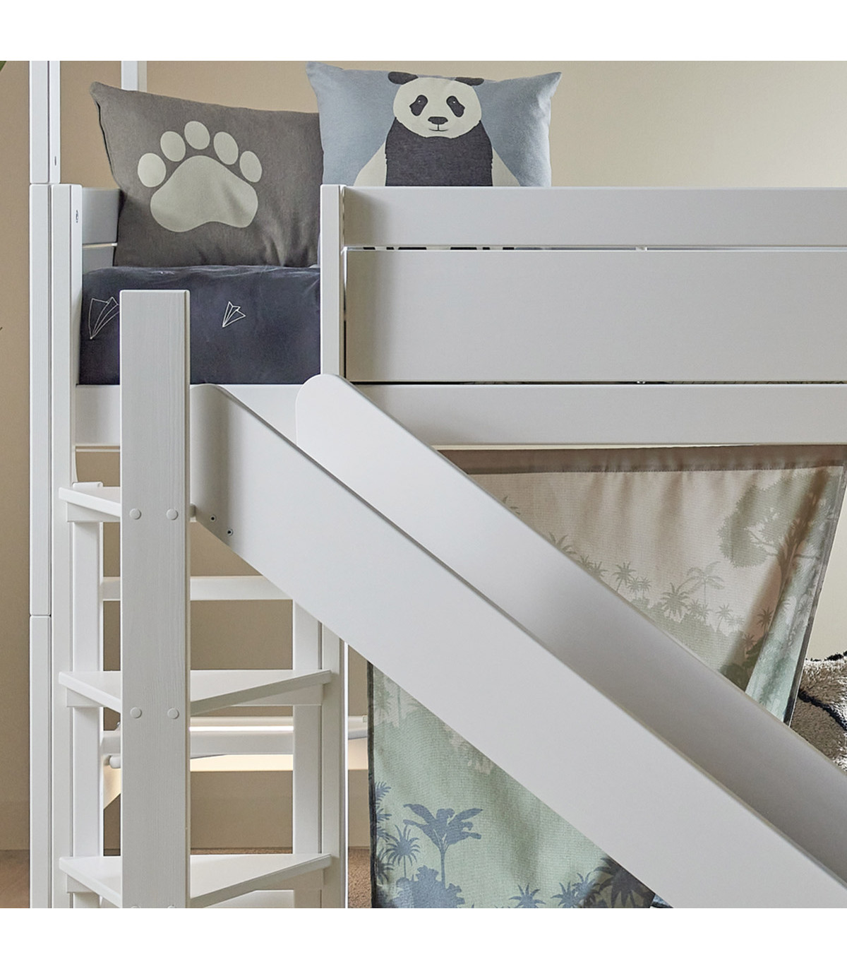 • Play and sleep area: A mid-high bed with a slide and ladder, inviting play and dreaming.