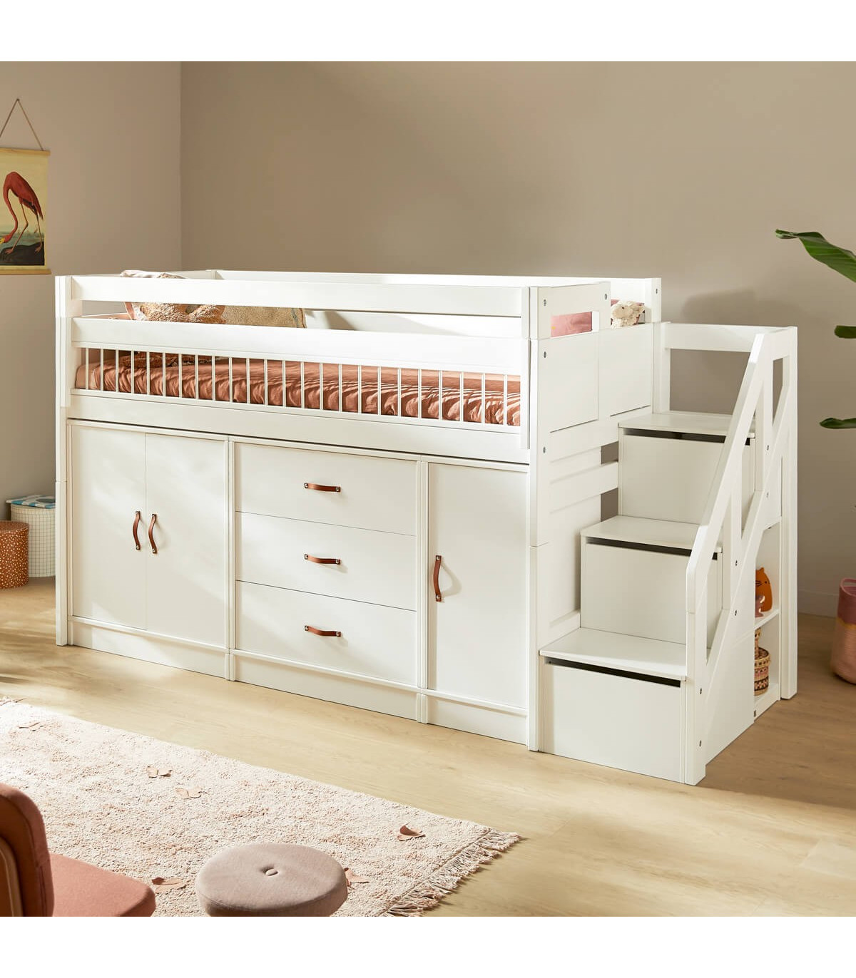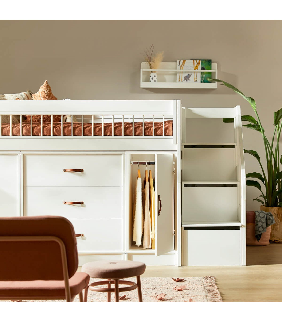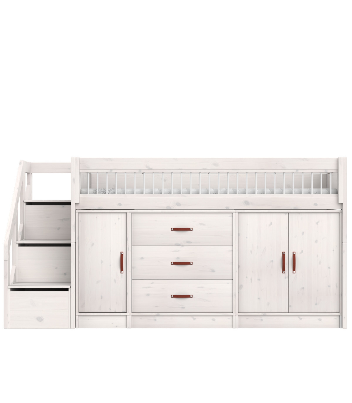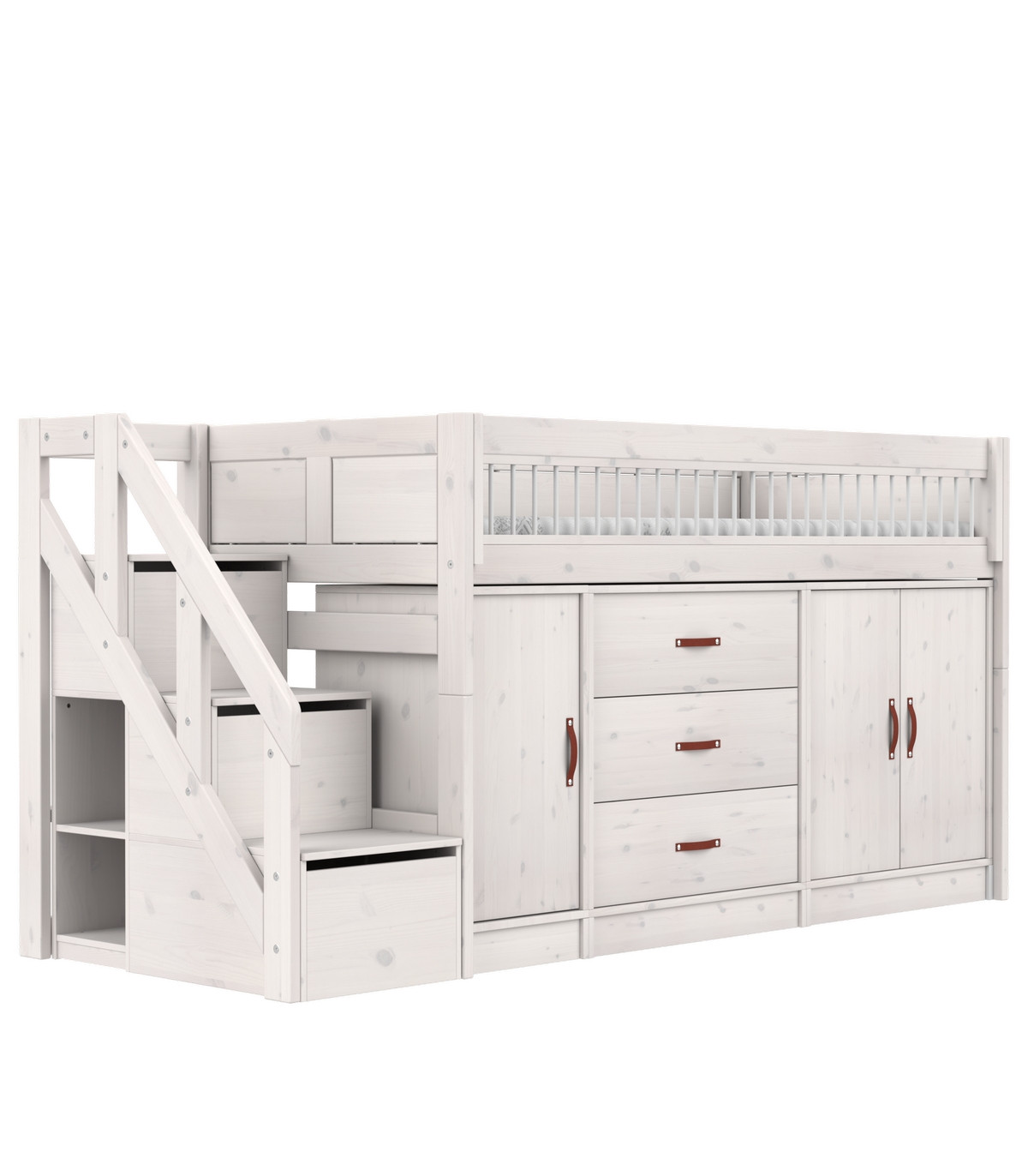 The LIFETIME Mid-Sleeper Bed All-in-One with Stair Storage and Premium Slatted Base in whitewash is an innovative solution to make the most of the space under the bed. Our flexible ALL-IN-ONE system allows you to combine various storage modules individually. With this bed combination, where the storage modules are aligned at the front, we've already integrated the most practical storage options.