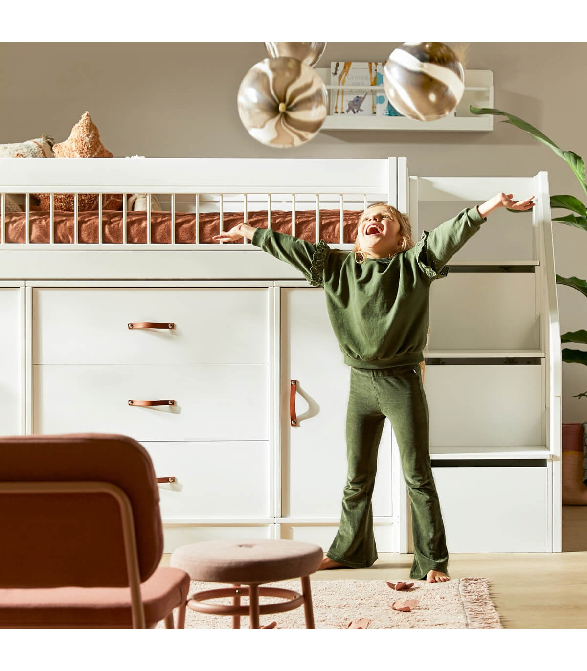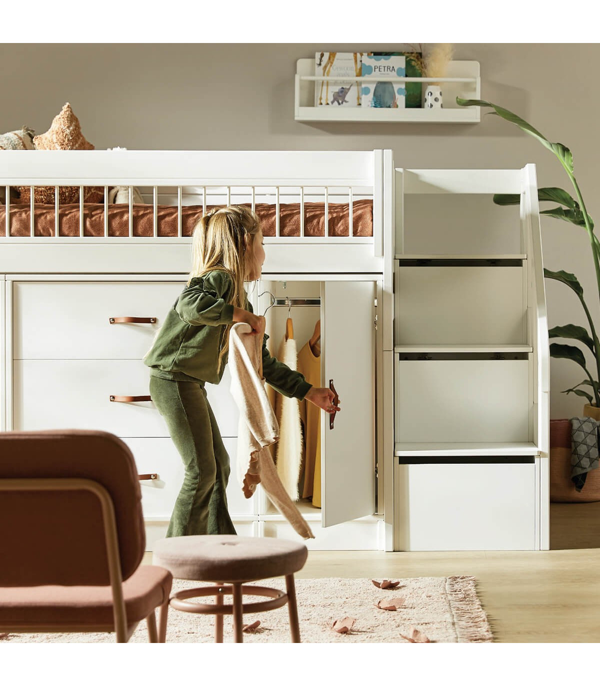 This bed combination eliminates the need for an additional wardrobe, as your child can easily access their clothes thanks to the child-friendly height of the modules. It's the ideal solution: a safe sleeping area on top, protected by solid bed rails, clever storage within the ladder steps, and the opportunity for children to practice independence by independently accessing their clothes and toys.