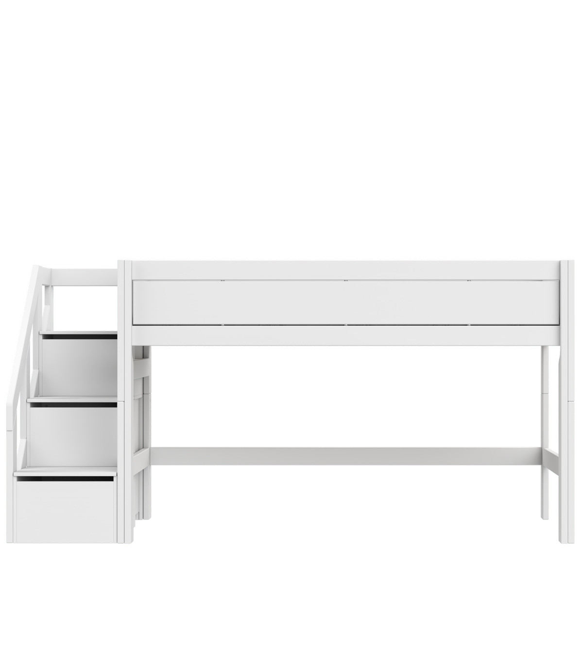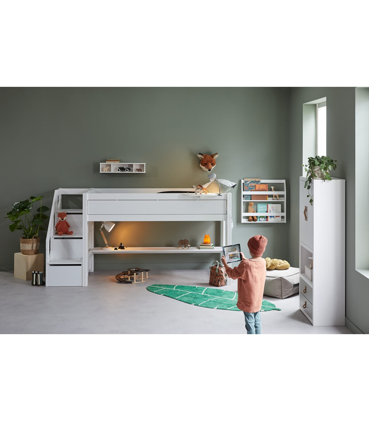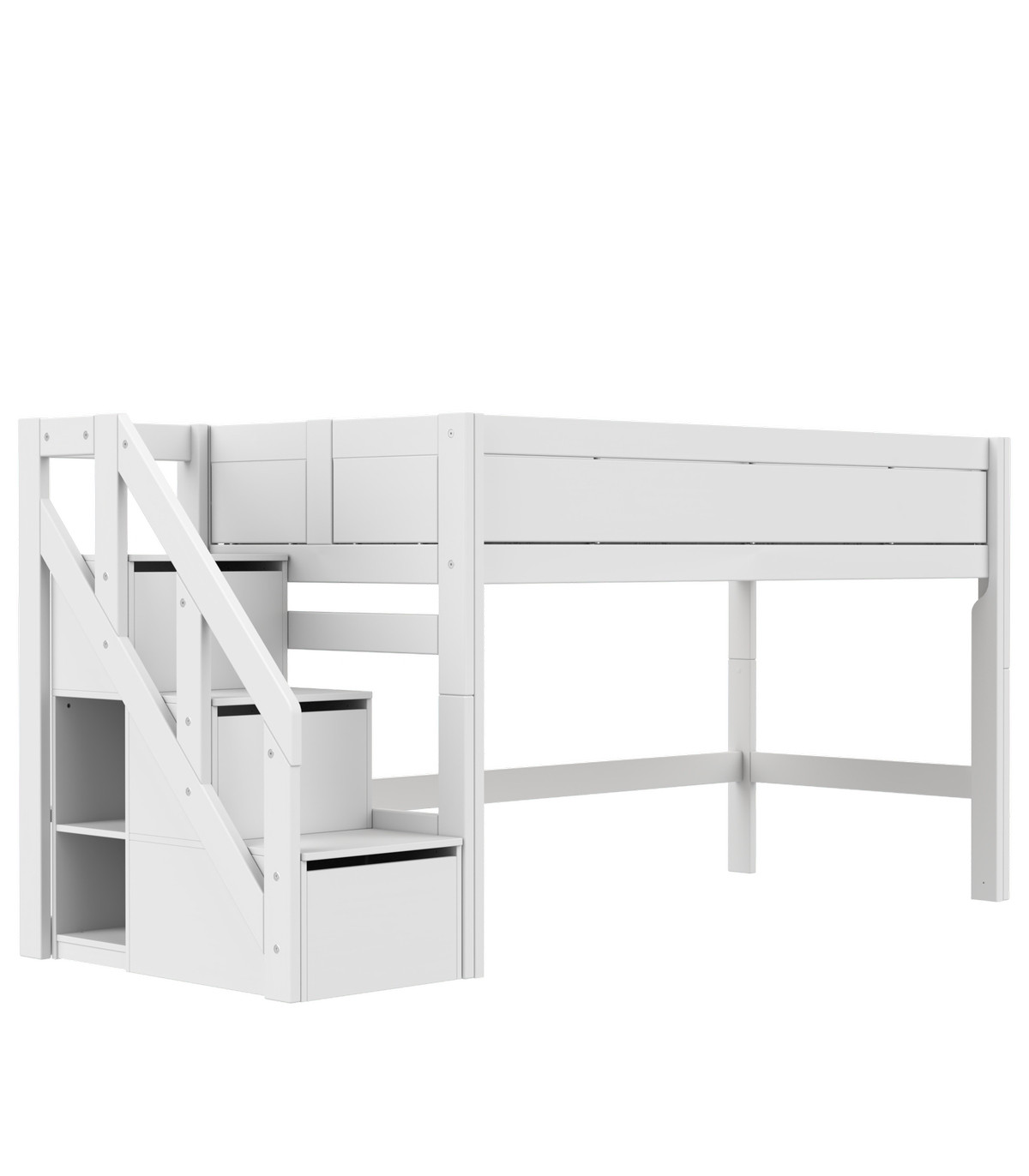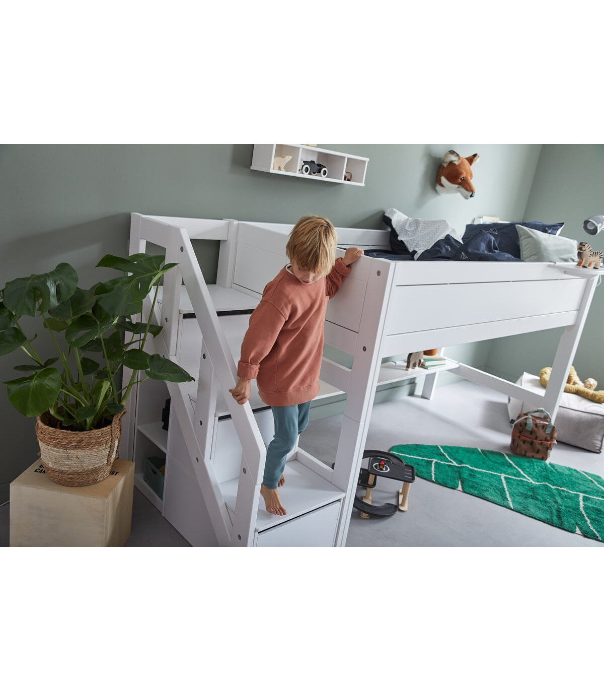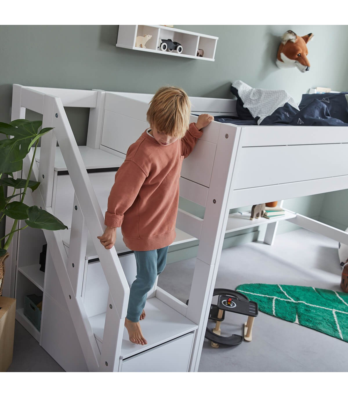 Découvrez notre lit mi-haut polyvalent avec escalier latéral, qui s'adapte idéalement aux besoins de votre enfant ! Ce lit innovant combine une montée sûre et facile avec un espace de rangement intelligent et offre en même temps une merveilleuse zone de jeu sous le lit.