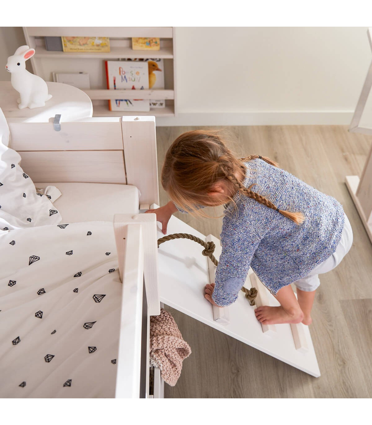 Le lit superposé est légèrement surélevé avec une base et offre ainsi plus de possibilités sous le lit. Ici, le lit a été équipé d’un toboggan, d’une planche de course et d’une protection contre les chutes au tableau et offre à l’enfant un peu plus jeune des possibilités de développement ludique. La hauteur de couchage est d’environ 53 cm encore à une hauteur facilement accessible et peut encore être maîtrisée par un enfant plus jeune. Pour plus de sécurité, les systèmes de protection contre les chutes attachables peuvent également être facilement intégrés. Sur le lit, il y a aussi de la place pour une construction de toit et transforme le lit en une cabane fraîche.