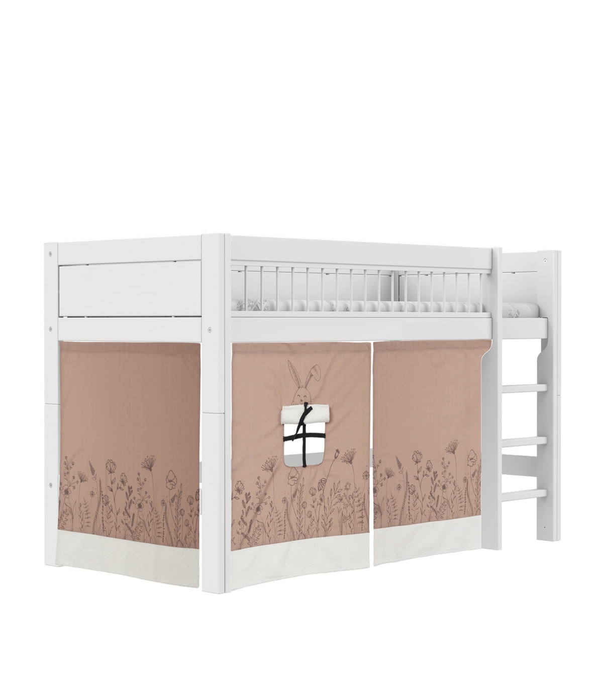 Le lit mi-hauteur offre beaucoup d’espace sous le lit pour la salle de jeux, le stockage, la lecture, etc. Il y a aussi un certain nombre de rideaux de jeu pour ce lit pour créer une grotte en dessous. L’échelle droite prend moins de place dans la pièce que l’échelle en pente.