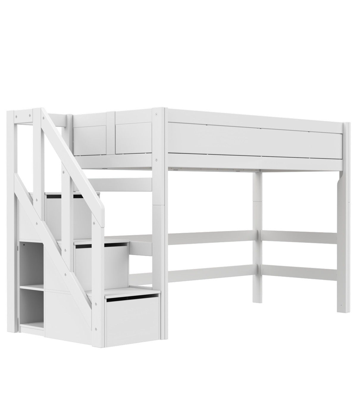 Un lit mezzanine moyen est légèrement plus haut que le lit à mi-hauteur, mais toujours à une hauteur facile à atteindre, faire aussi pour la literie. Les escaliers sur le côté peuvent être montés à gauche ou à droite et, en plus d’un endroit pour monter, offrent également beaucoup d’espace de rangement.