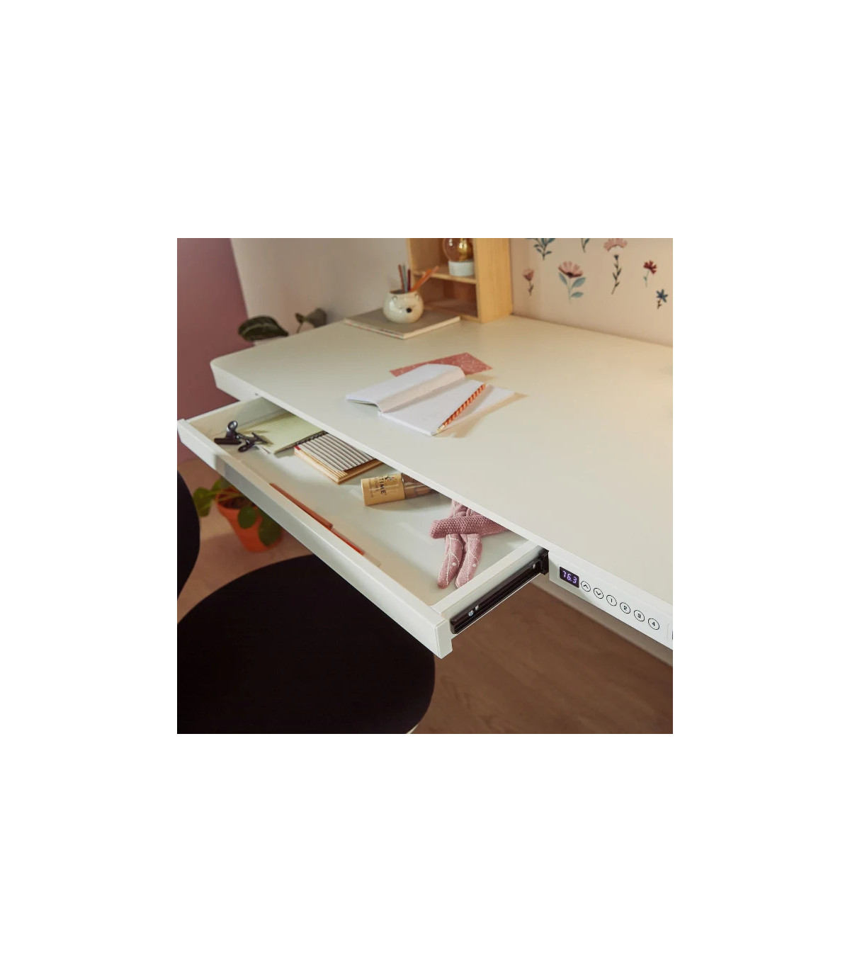 Che si tratti di fare i compiti, giocare o di progetti creativi, la regolazione elettrica dell'altezza da 72 a 121 cm permette di passare senza sforzo dalla posizione seduta a quella in piedi. Questo previene il mal di schiena e aiuta a rimanere concentrati più a lungo. La funzione di memoria dell'altezza salva fino a quattro altezze preferite, in modo da poter trovare l'impostazione perfetta con un solo tocco.
